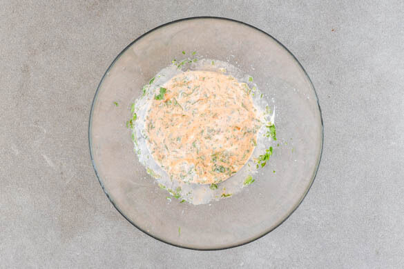 Den Koriander fein schneiden. Die Limette halbieren und eine Hälfte in Spalten schneiden, die andere Hälfte auspressen. Den Koriander mit dem Limettensaft, 3EL veganer Mayonnaise, der Sriracha-Sauce und 1 kräftigen Prise Salz verrühren und mit Salz abschmecken.
