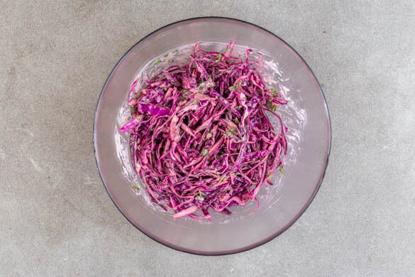 Den Rotkohl in feine Streifen schneiden, kräftig mit der Koriandercreme verkneten und mit Salz und Pfeffer abschmecken.