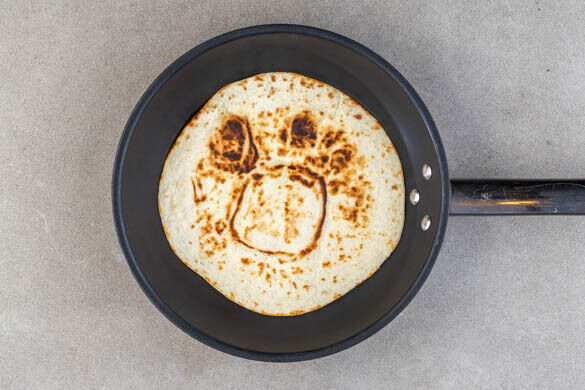 Nacheinander 4 Tortillas in einer zweiten mittelgroßen Pfanne ohne Zugabe von Fett bei mittlerer Hitze auf jeder Seite ca. 15Sek. erwärmen. Aus der Pfanne nehmen und beiseitestellen, die Pfanne wird weiterverwendet. Alternativ die Tortillas aufeinanderstapeln und bei 800W 35–40Sek. in der Mikrowelle erwärmen.