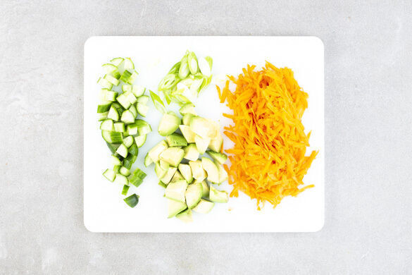Die Karotten ggf. schälen und mit einer Küchenreibe grob raspeln. Die Gurke längs vierteln und in ca. 0,5cm kleine Stücke schneiden. Die Lauchzwiebeln schräg in feine Ringe schneiden. Die Avocado halbieren und den Kern entfernen. Das Fruchtfleisch mit einem Löffel aus der Schale heben und in ca. 1cm große Stücke schneiden.