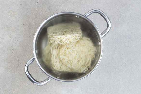 Die Nudeln in das kochende Wasser geben und in 3–5Min. bissfest kochen. In ein Sieb abgießen, kalt abschrecken und gut abtropfen lassen.