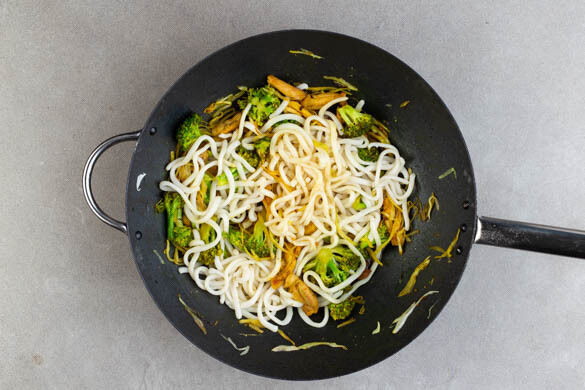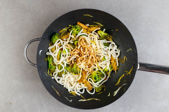 Das Gemüse aus der Pfanne nehmen und beiseitestellen. Das Fleisch in der Pfanne mit 2EL Pflanzenöl bei starker Hitze ca. 3Min. scharf anbraten, dann das Gemüse, das Currypulver sowie die Nudeln dazugeben und ca. 1Min. mitbraten.