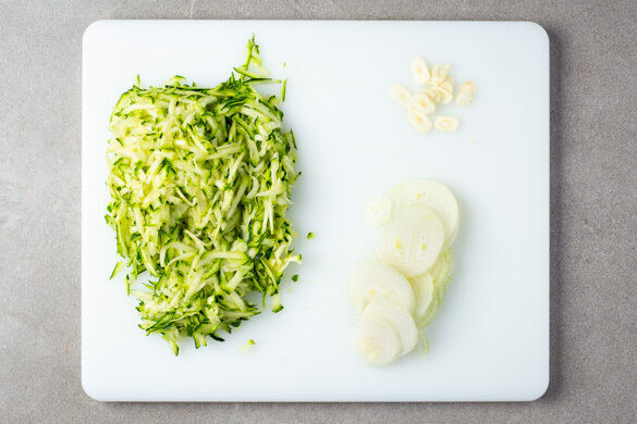 In einem mittelgroßen Topf ausreichend gesalzenes Wasser für die Gnocchi zum Kochen bringen. Die Zucchini grob raspeln. Die Zwiebel schälen und in dünne Ringe schneiden. Den Knoblauch schälen und in dünne Scheibchen schneiden.
