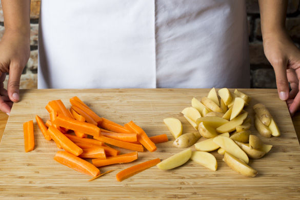 Den Umluftofen auf 220°C vorheizen. Die Kartoffeln in ca. 1-2cm dicke Stifte oder Spalten schneiden, die Karotten schälen und ebenso in gleich große Stifte schneiden.