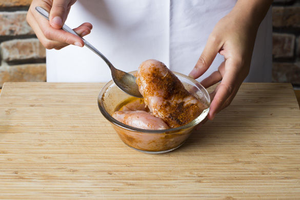 In der Zwischenzeit, die Hähnchenbrustfilets mit dem Gewürz und 1-2EL Olivenöl mischen.