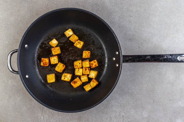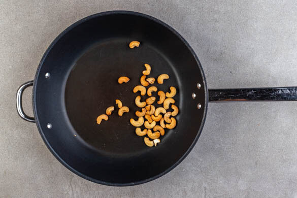 Den Tofu mit Küchenkrepp sanft auspressen und in 2–3cm große Würfel schneiden. Die Cashews in einer mittelgroßen Pfanne ohne Zugabe von Fett bei mittlerer Hitze 1–2Min. goldbraun anrösten. Vorsicht, sie können schnell zu dunkel werden. Zum Abkühlen aus der Pfanne nehmen und beiseitestellen. Die Pfanne wird weiterverwendet.