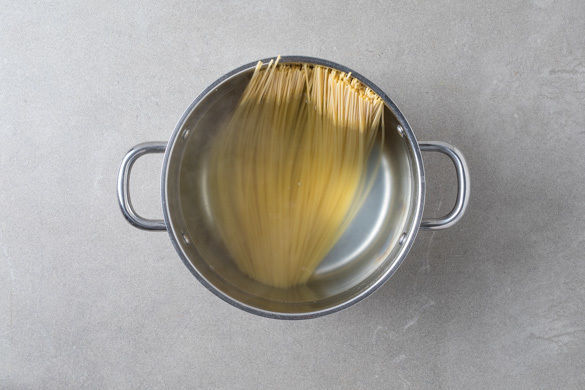 In einem mittelgroßen Topf ausreichend gesalzenes Wasser für die Pasta zum Kochen bringen. Die Pasta in das kochende Wasser geben und in 7–9Min. gar kochen. Mit einem Messbecher ca. 200ml Pastawasser abschöpfen, dann in ein Sieb abgießen. Die Pasta zurück in den Topf geben, mit 1EL Olivenöl mischen und warm halten.