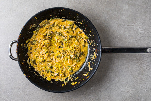 Den Knoblauch und die Kapern in einer großen Pfanne mit 1EL Olivenöl und Chiliflocken nach Geschmack bei mittlerer Hitze 30Sek.–1Min. anbraten. Den Fenchel, den Lauch und ca. 100ml Pastawasser dazugeben und 8–10Min. braten, bis der Fenchel weich und gar ist.