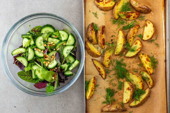 Griechische Veggie-Hackbällchen mit Feta dazu Ofengemüse und Wildkräutersalat