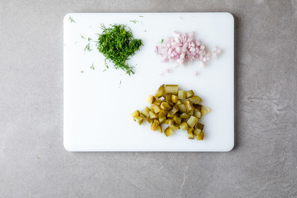 Währenddessen die Schalotte schälen und in feine Würfel schneiden. Die Gewürzgurke abtropfen lassen, das Gurkenwasser aufbewahren. Die Gurke klein würfeln. Den Dill von den Stängeln zupfen und grob hacken. Den Apfel in ca. 1-2cm große Stücke schneiden.