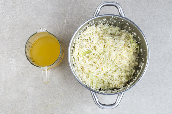 Das Brühgewürz in 500ml heißem Wasser auflösen. Das geriebene Gemüse, die Zwiebeln und den Knoblauch in einem großen Topf mit 2EL Olivenöl bei mittlerer Hitze 2–3Min. anbraten. Mit ca. ⅔ der Gewürzmischung und Pfeffer würzen, dann die Brühe unter Rühren nach und nach hinzugeben, sodass das Gemüse bedeckt ist.
