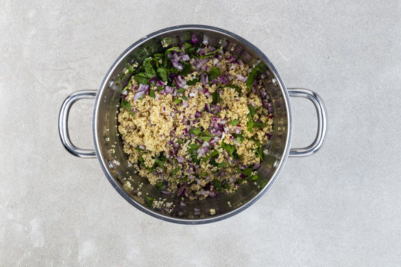 Die Quinoa mit den Zwiebeln und der Petersilie vermengen und mit Salz und Pfeffer abschmecken.