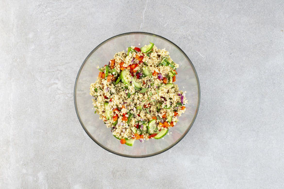 Die Paprika- und die Gurkenwürfel unter die restliche Quinoa mengen. Aus 1–2EL Olivenöl, 1EL Balsamicoessig, dem restlichen Estragon und 1 Prise Zucker ein Dressing anrühren und unter den Quinoasalat rühren. Den Quinoasalat mit Salz und Pfeffer abschmecken und zu den Portobellopilzen servieren.