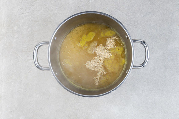 Den Backofen auf 190°C Umluft (210°C Ober-/Unterhitze) vorheizen. In einem mittelgroßen Topf 650ml Wasser mit dem Brühgewürz zum Kochen bringen. Die Quinoa in einem Sieb mit warmem Wasser abspülen, in die kochende Brühe geben und abgedeckt bei niedriger Hitze 10–12Min. sanft köcheln lassen, bis die Quinoa gar ist. Vom Herd nehmen und bis zur weiteren Verarbeitung bereitstellen.