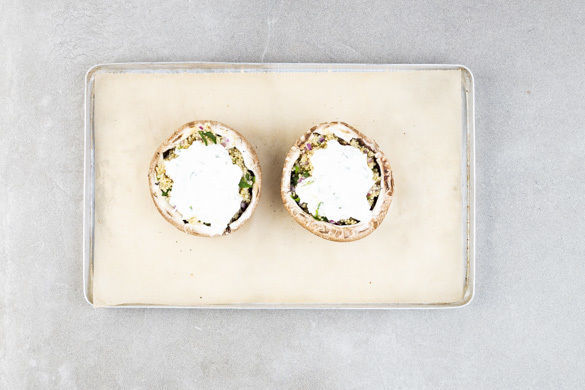 Den Strunk der Pilze entfernen und die Pilze mit 1TL Olivenöl sowie Salz und Pfeffer würzen. Jeden Pilz mit 2–3EL Quinoa füllen und die Käsecreme darauf verteilen. Die gefüllten Pilze auf ein mit Backpapier belegtes Backblech geben und 10–15Min. im Ofen backen.
