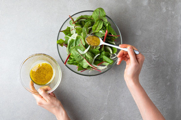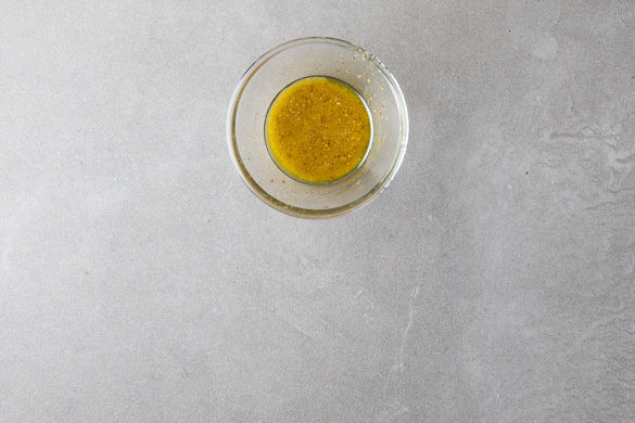 1–2EL Senf mit 2EL Olivenöl und 2–3EL Essig verrühren und das Dressing mit Salz, Pfeffer und 1 Prise Zucker abschmecken.