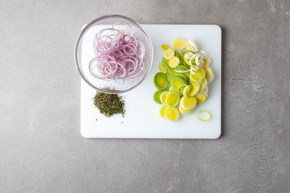 Den Backofen auf 210°C Umluft (230°C Ober-/Unterhitze) vorheizen. Die Zwiebeln schälen, in feine Ringe schneiden und mit 1–2 Prisen Zucker vermengen. Den Lauch in ca. 0,5cm breite Scheiben schneiden. Die Rosmarinnadeln abzupfen und fein schneiden.
