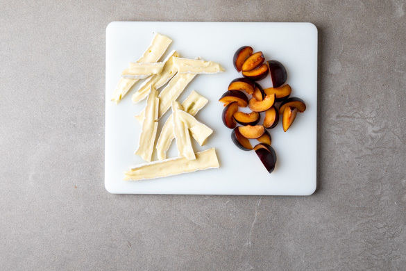 Den Brie in ca. 0,5cm dünne Scheiben schneiden. Die Pflaumen um den Stein herum halbieren, den Stein entfernen und jede Hälfte in 4 Spalten schneiden.