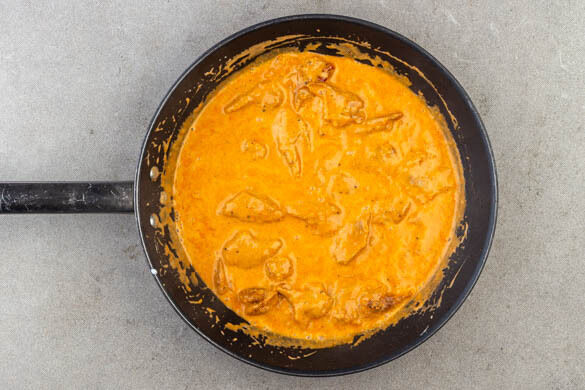 Die Kokosmilch, die Sojasauce, die ½ der Chilipaste und 1EL Zucker einrühren und zum Köcheln bringen, bis sich die Chilipaste auflöst. Die veganen Hähnchenschnetzel bei niedriger bis mittlerer Hitze ca. 5Min. köcheln lassen, bis die Sauce eindickt, dabei stetig rühren.