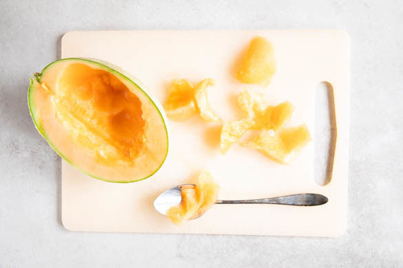 Die Melone halbieren. Die Kerne mit einem Löffel herausschaben, dann das Fruchtfleisch einer Hälfte mit dem Löffel in kleinen Stücken aus der Schale lösen. Tipp: Die restliche Melone für den nächsten Obstsalat verwenden oder als Dessert genießen.