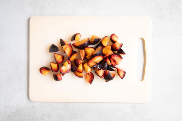 Die Pflaumen halbieren, entsteinen und in kleine Stücke schneiden.