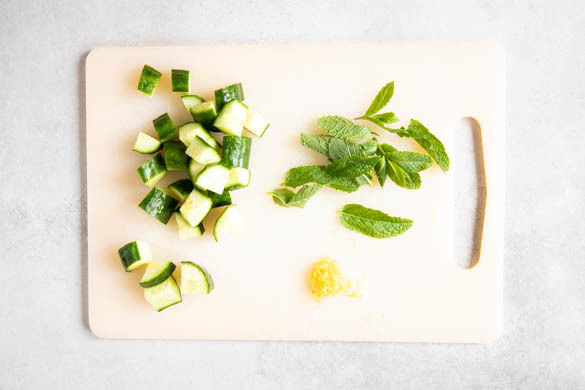 Die Gurke längs halbieren und in ca. 1cm große Stücke schneiden. Die Minzeblätter von den Stängeln zupfen. Ca. 1TL Zitronenschale abreiben, dann die Zitrone halbieren und auspressen.