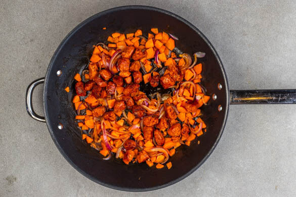 Die vegane Chorizo, die Karotten und die Zwiebeln in einer mittelgroßen Pfanne mit 1EL Olivenöl bei mittlerer Hitze in 3–5Min. goldbraun anbraten.