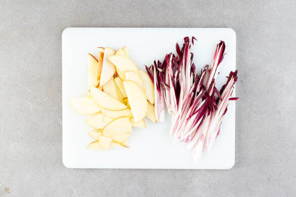 Die Äpfel halbieren, entkernen und in dünne Scheiben schneiden. Die Apfelscheiben mit 2EL Zitronensaft vermengen, damit sie nicht braun werden. Die Radicchio-Köpfe ggf. unten abschneiden, dann den Radicchio längs halbieren und längs in dünne Streifen schneiden.