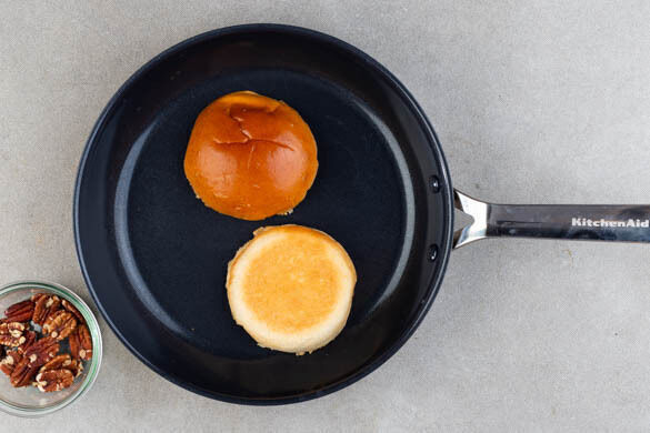 Die Pekannüsse in einer großen Pfanne ohne Zugabe von Fett bei mittlerer Hitze 2–3Min. anrösten, bis sie duften und goldbraun sind. Zum Abkühlen aus der Pfanne nehmen. Die Brötchen aufschneiden und in der Pfanne auf der Schnittseite 1–2Min. leicht knusprig anrösten. Aus der Pfanne nehmen.