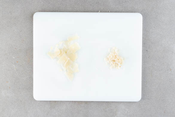 Den Käse mit einem Sparschäler in dünne Scheiben hobeln. Den Meerrettich schälen und ca. 1EL Meerrettich abreiben.