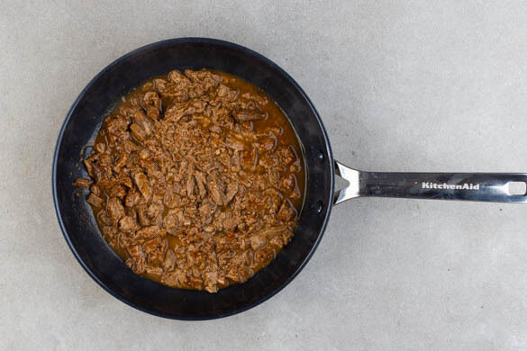 Das vegane Rindergulasch gleichmäßig in der Pfanne verteilen und bei mittlerer Hitze 2–4Min. erwärmen oder bis das Gulasch komplett erwärmt ist.
