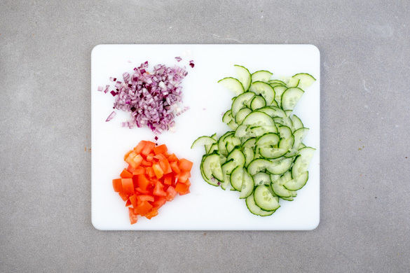 Den Backofen auf 200°C (180°C Umluft) vorheizen. Die Tomate in ca. 1cm große Würfel schneiden. Die restliche Gurke längs halbieren und in dünne Scheiben schneiden. Die Zwiebel schälen, halbieren und fein würfeln.