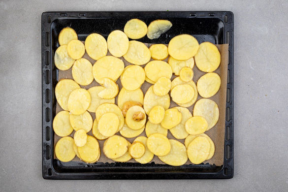 Die Kartoffeln samt Schale in ca. 1cm dicke Scheiben schneiden und mit 1EL Olivenöl sowie 1 Prise Salz vermengen. Auf einem mit Backpapier ausgelegten Backblech verteilen und im Ofen 20–25Min. rösten, bis die Kartoffeln knusprig und gar sind. Nach der Hälfte der Zeit wenden.