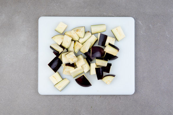 Den Backofen mit Grillfunktion oder Ober-/Unterhitze auf 250°C vorheizen. Die Aubergine je nach Größe der Länge nach vierteln oder sechsteln und jedes Stück quer in 2–2,5cm große Würfel schneiden.