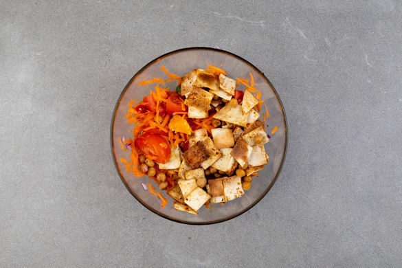 Die Karotten, die Zwiebeln, die Orangenstückchen, die Peperoni nach Geschmack, die Oliven und die Tomaten vermengen. Die Kichererbsen und die Tortillastücke unterheben und den Salat mit der Orangenschale nach Geschmack verfeinern.