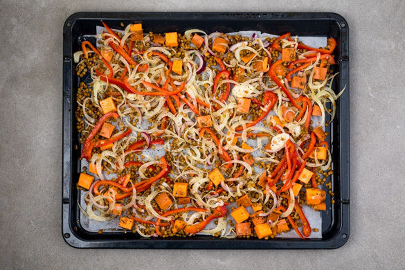 Den Ofen auf 240°C (220°C Umluft) vorheizen. Die Paprika vierteln, entkernen und in dünne Streifen schneiden. Die Süßkartoffel schälen und in 1–2cm große Würfel schneiden. Den Fenchel halbieren und in feine Streifen schneiden, den Strunk entfernen. Die Zwiebel schälen, halbieren und in feine Streifen schneiden. Die Linsen in ein Sieb abgießen und kalt abspülen.