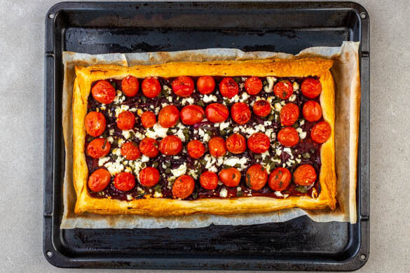 Die Tartes im Ofen 12–18Min. backen, bis die Kirschtomaten beginnen aufzuplatzen und der Teig goldbraun und an den Rändern knusprig ist. Zur Hälfte der Backzeit die Position der Backbleche tauschen.