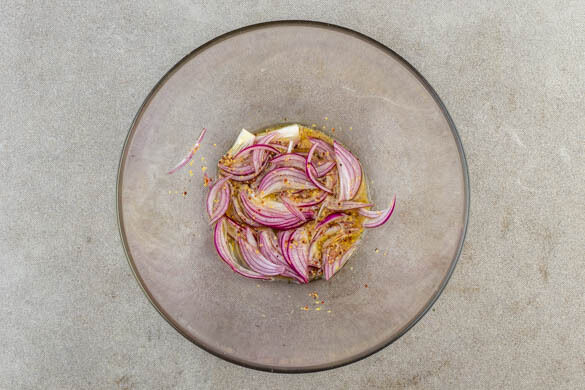2EL Olivenöl, 2EL hellen Essig (am besten Apfelessig), ½EL grobkörnigen Senf, ½TL Zucker und je 1 kräftige Prise Salz und Pfeffer zu einem Dressing verrühren. Mit den Zwiebelstreifen vermengen und beiseitestellen.