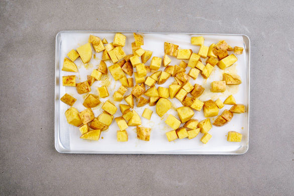 Die Kartoffeln samt Schale in ca. 1cm große Würfel schneiden und auf einem mit Backpapier ausgelegten Backblech verteilen. 2EL Olivenöl mit dem Currypulver nach Geschmack verrühren und über die Kartoffeln verteilen, dann gut mischen. Die Kartoffeln ca. 20Min. im Ofen rösten, bis sie knusprig und an den Rändern leicht gebräunt sind.