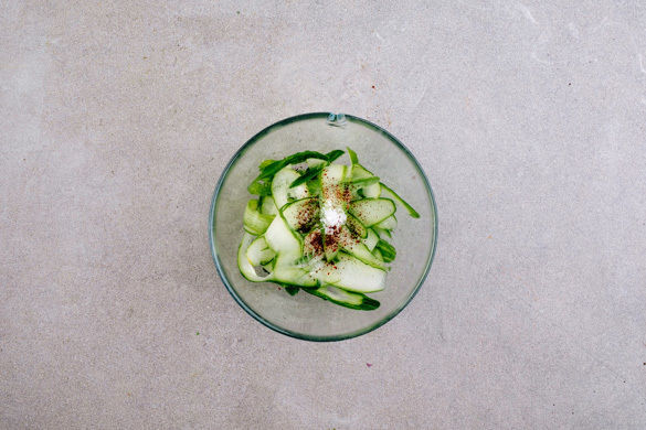Die Brötchen im Ofen 3–5Min. aufbacken. Die Zitrone halbieren und auspressen. Die Gurke mit einem Sparschäler rundherum abschälen. Die Gurkenstreifen mit 2TL Zitronensaft und Salz würzen.