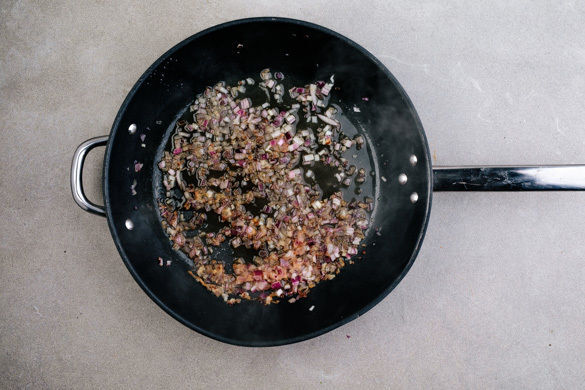 Die Zwiebeln schälen, halbieren, fein würfeln und in einer kleinen Pfanne mit 1TL Olivenöl bei mittlerer Hitze 5–8Min. sanft anbraten. Ggf. etwas Wasser hinzugeben, damit die Zwiebeln nicht anbrennen.