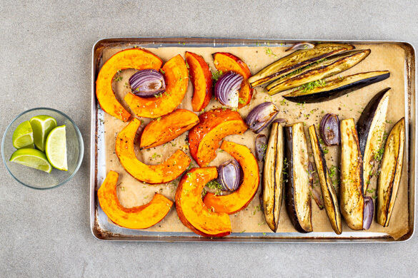Das Gemüse auf ein mit Backpapier ausgelegtes Backblech geben und mit 2EL Pflanzenöl, ½TL Salz und 1 kräftigen Prise Pfeffer vermengen. Das Öl leicht einmassieren, dann das Gemüse gleichmäßig verteilen und 20–25Min. im Ofen goldbraun backen.