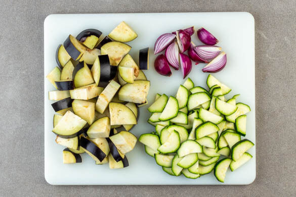 Den Backofen auf 220°C (200°C Umluft) vorheizen. Die Aubergine der Länge nach vierteln, dann quer in ca. 1cm dicke Scheiben schneiden. Die Zucchini längs halbieren und quer in dünne Scheiben schneiden. Die Zwiebel schälen und in Spalten schneiden.