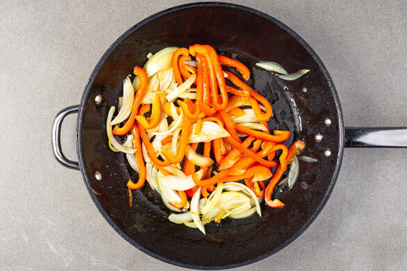 Den Backofen auf 240°C (220°C Umluft) vorheizen. Die Paprika vierteln, entkernen und in ca. 1cm dünne Streifen schneiden. Die Zwiebeln schälen, halbieren und in feine Streifen schneiden.