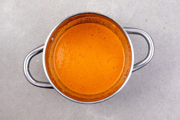Die Zwiebeln und den Knoblauch in einem mittelgroßen Topf mit 1EL Olivenöl bei mittlerer Hitze 1–2Min. glasig anbraten. Die 1/2 der Gewürzmischung untermischen, dann ca. die 1/2 der Knoblauch-Zwiebel-Mischung herausnehmen und beiseitestellen. Die passierten Tomaten und ca. 100ml Pastawasser in den Topf geben und die Sauce ca. 10Min. sanft köcheln lassen.