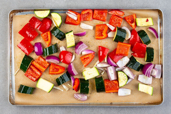 Den Backofen auf 200°C (180°C Umluft) vorheizen. Die Paprika vierteln, entkernen und in ca. 3cm große Stücke schneiden. Die Zucchini längs halbieren und ebenfalls in ca. 3cm große Stücke schneiden. Die Zwiebel schälen, halbieren und in dicke Spalten schneiden.