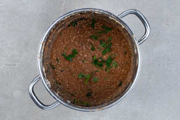 Die Linsen und den Bulgur in ein Sieb abgießen, gut abspülen und zurück in den Topf geben. Die Tomaten, die Zwiebelwürfel, die ½ des Tomatenmarks, die Granatapfelmelasse und die ½ der Gewürzmischung hinzugeben und alles mit einem Stabmixer nicht zu fein pürieren. Mit Salz und Pfeffer abschmecken und die ½ der Kräuter unterrühren.