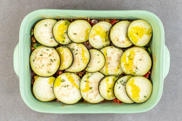 Die Auberginenscheiben gleichmäßig auf dem Linsengemüse verteilen, mit 1 kräftigen Prise Salz würzen und mit 2EL Olivenöl beträufeln. Den restlichen Thymian über die Auberginen streuen, mit Alufolie abdecken und ca. 15Min. backen.