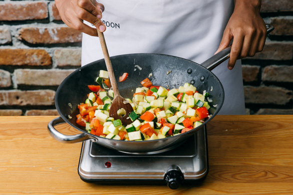 Die Schalotten und den Knoblauch in einer großen Pfanne oder einem Wok mit 2EL Olivenöl bei mittlerer Hitze ca. 1Min. anschwitzen. Die Paprika und die Zucchini dazugeben und 6–8Min. mitbraten.