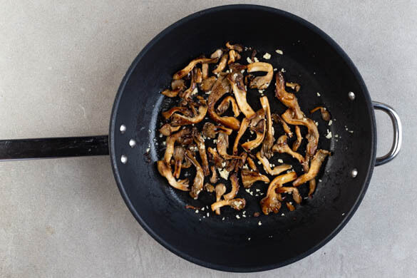Den Knoblauch schälen, fein würfeln und zu den Pilzen in die Pfanne geben. Mit je 1 Prise Salz und Pfeffer würzen und ca. 1Min. mitbraten, dann die Pfanne vom Herd nehmen.